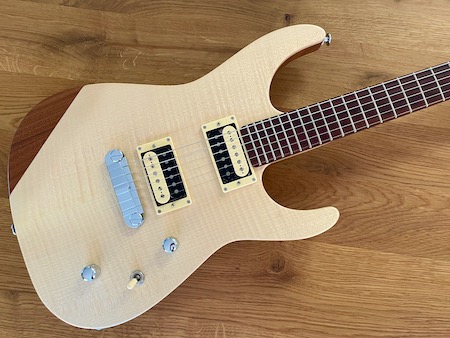 Ihren Namen hat die Gitarre von der "gestreiften" Decke aus attraktiv geflammtem Ahorn. Der Boden des Korpus besteht aus dem selben Holz. Für den Kern des Korpus habe ich Sipo verwendet, einen Verwandten von Mahagoni.